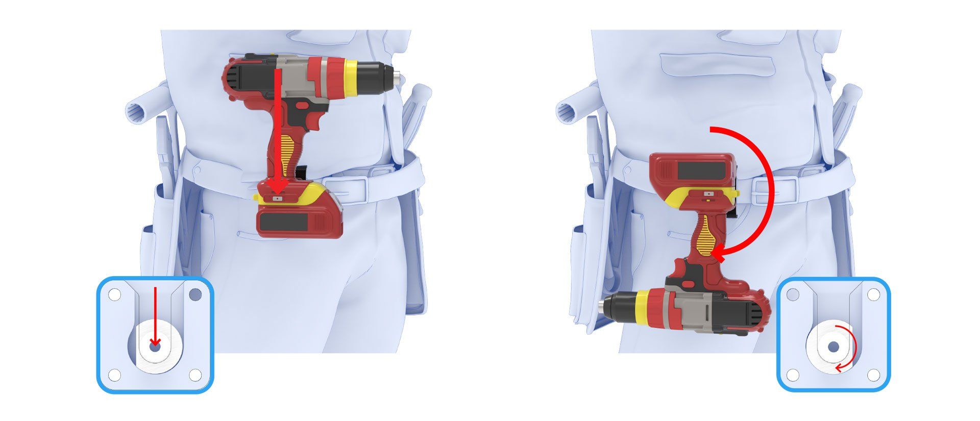 This tool clip will connect to any brand of cordless drill or impactor and enables the tool to be attached to the users’ tool belt. It also provides a locking action so that the tool cannot accidentally fall out. The user puts the tool receiver on to their tool belt and then installs the tool attachment to the factory/brand supplied tool clip on their drill or impactor. With the tool in hand in its work position, the user will slide the tool attachment into the tool receiver and then let the drill naturally rotate down 180 degrees, thus locking the attachment to the receiver.
